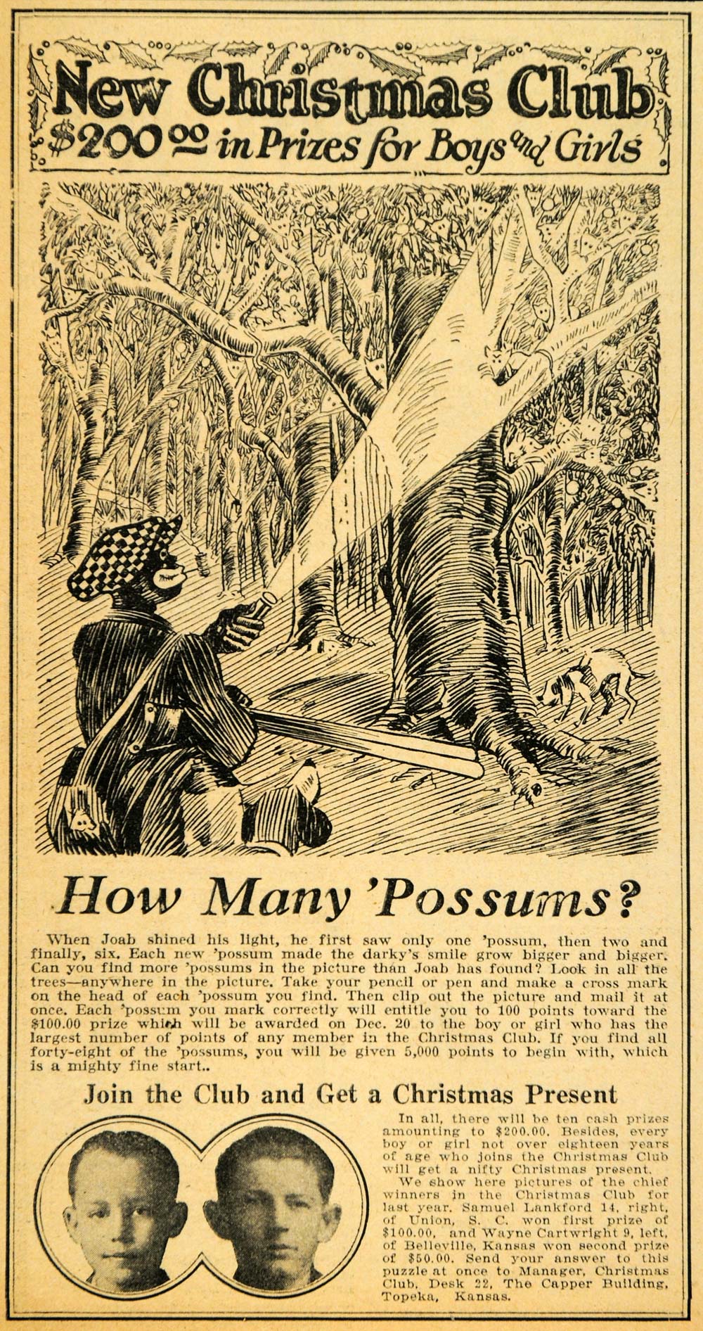 Keywords specific to this image: Vintage Advertising, Competitions, Possums, The Capper Building Topeka Kansas, Hunting, Racist, Hunting Dogs, Joab