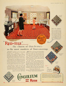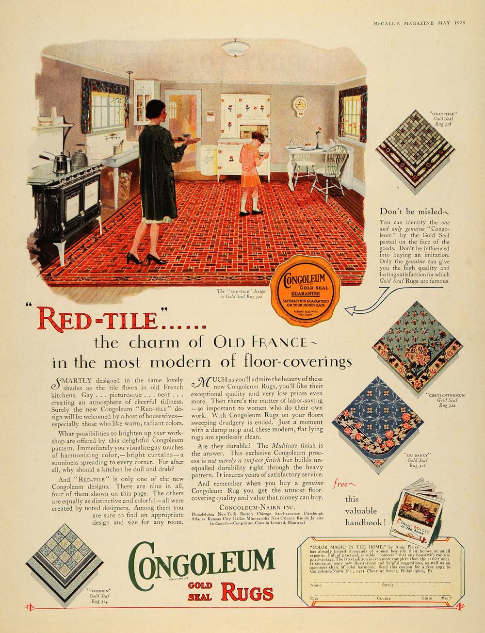 This is an original 1928 color print ad promoting the Red Tile Gold Seal Rug from Congoleum-Nair Incorporation located at 1421 Chestnut Street, Philadelphia, Pennsylvania.