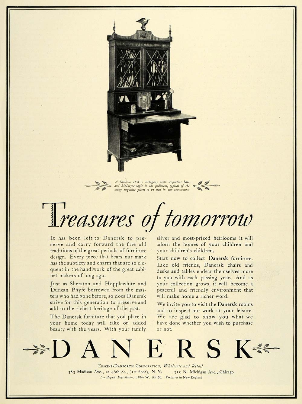 This is an original 1928 black and white print ad for the Danersk Furniture from Erskine-Danforth Corporation located on 383 Madison Avenue at 46th Street, New York City.