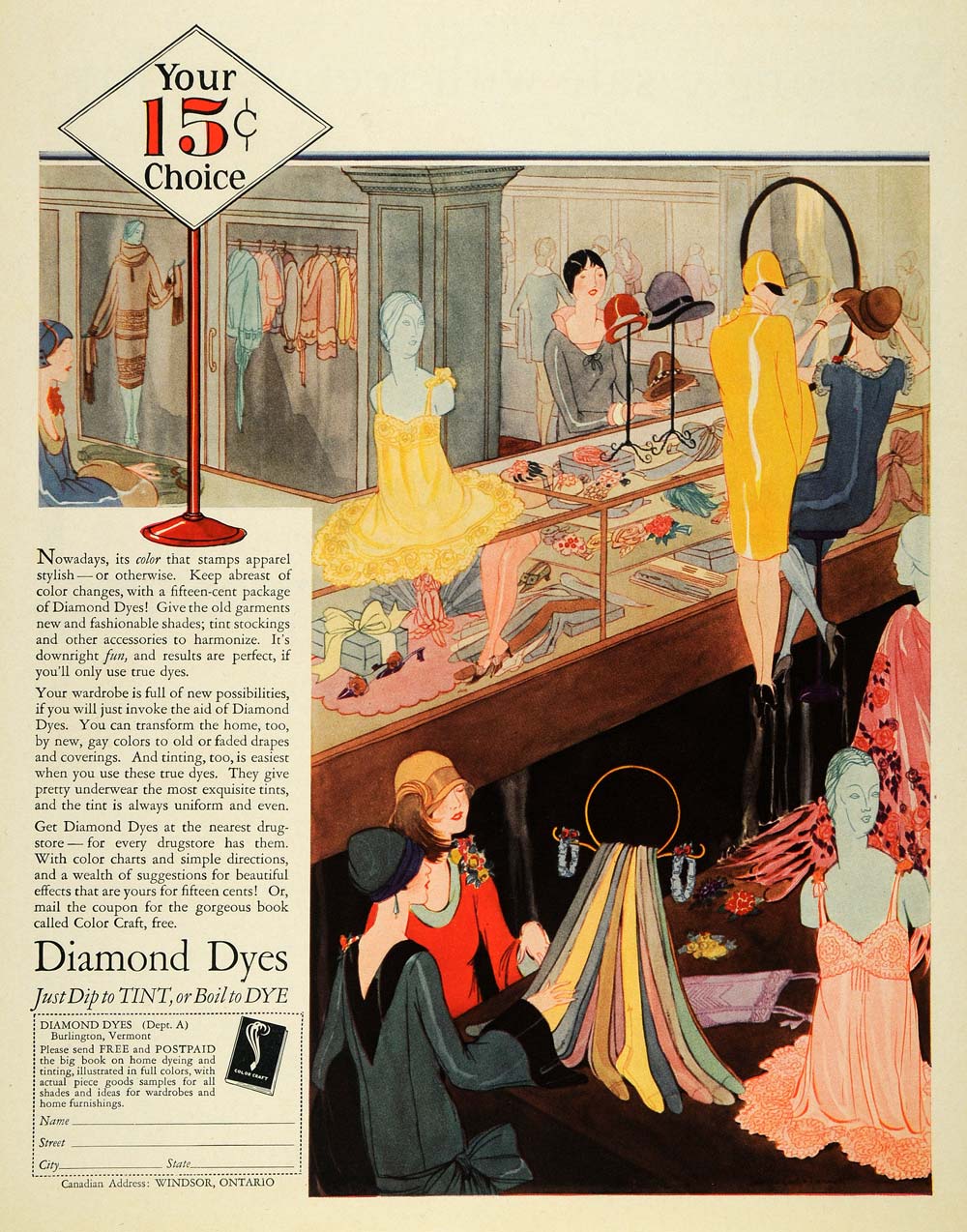 This is an original 1928 color print ad promoting the Diamond Dyes, a fabric dyeing from Diamond Dyes located in Burlington, Vermont.
