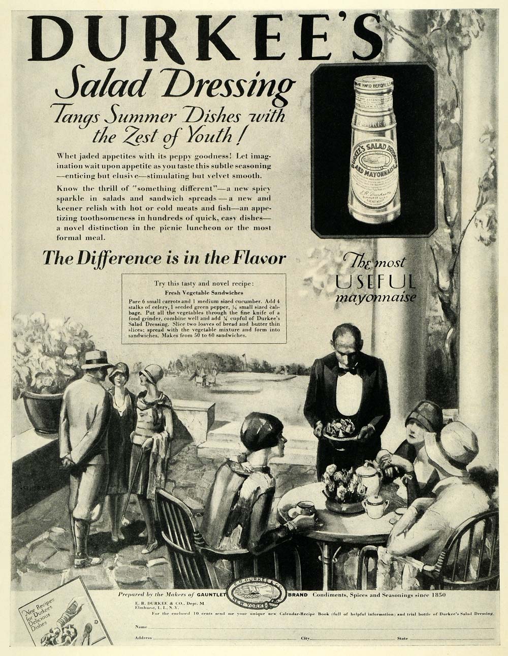 This is an original 1928 black and white print ad for Durkee's Salad Dressing and Mayonnaise by E. R. Durkee & Company of Elmhurst, Long Island. This ad has a recipe for Fresh Vegetable Sandwiches