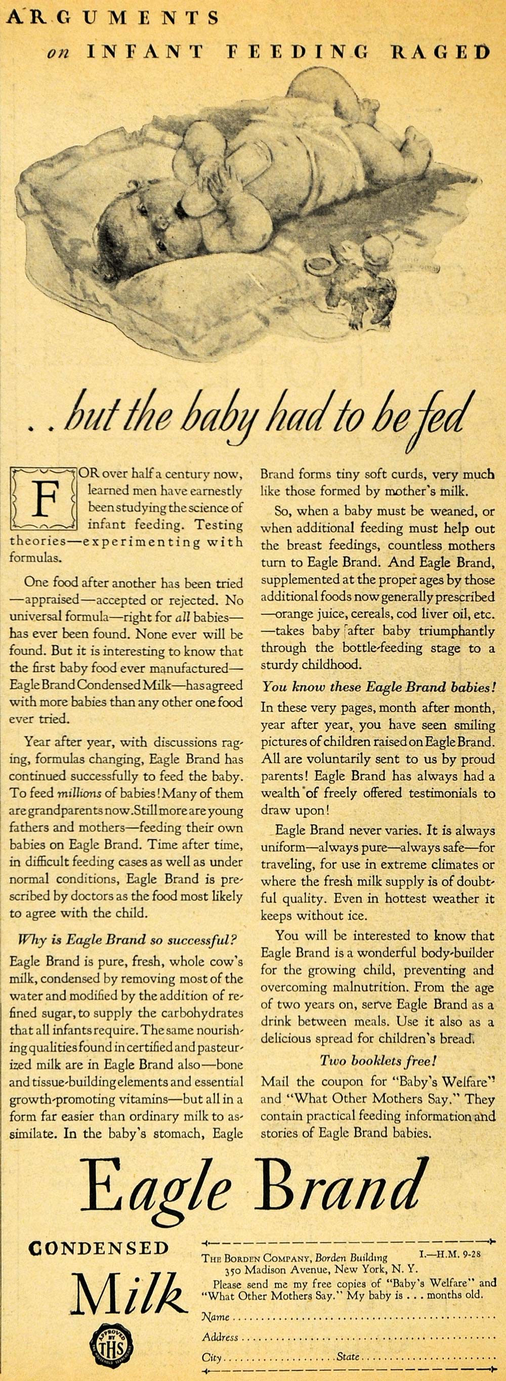 This is an original 1928 black and white print ad for Eagle Brand Condensed Milk.