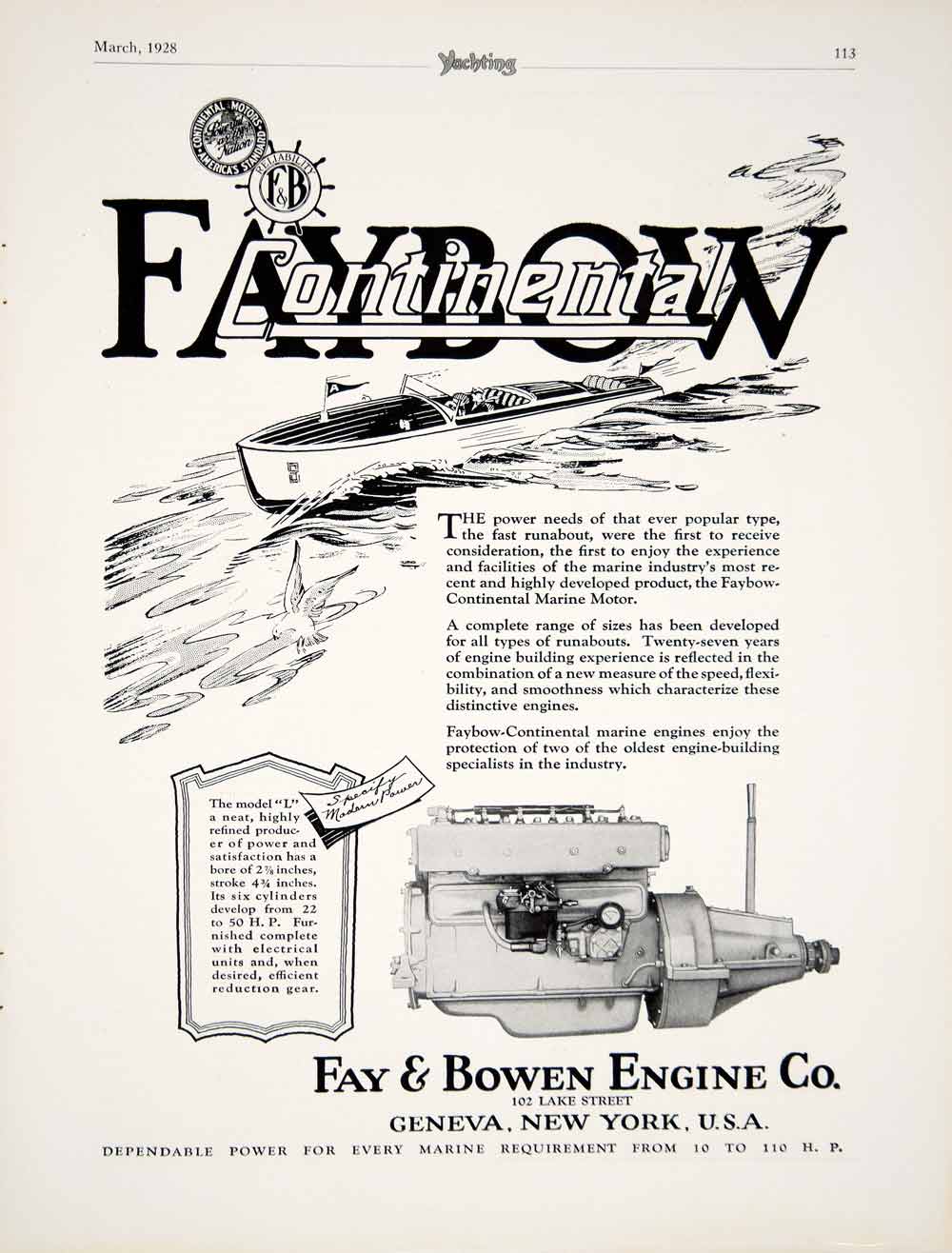 This is an original 1928 black and white print ad for the Model L Continental Marine Motor that was made and sold by the Fay & Bowen Engine Company of 102 Lake Street, Geneva, New York (NY), USA during the Roaring Twenties era.