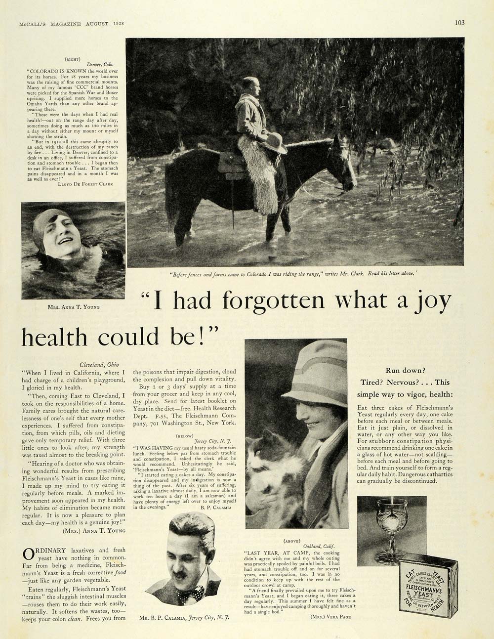This is an original 1928 black and white print ad for Fleischmann's Yeast, featuring testimonials by Mrs. Vera Page of Oakland, California, Mr. B. P. Calamia of Jersey City, New Jersey, Mrs. Anna T. Young of Cleveland,Ohio and Lloyd De Forest Clark of Denver, Colorado.