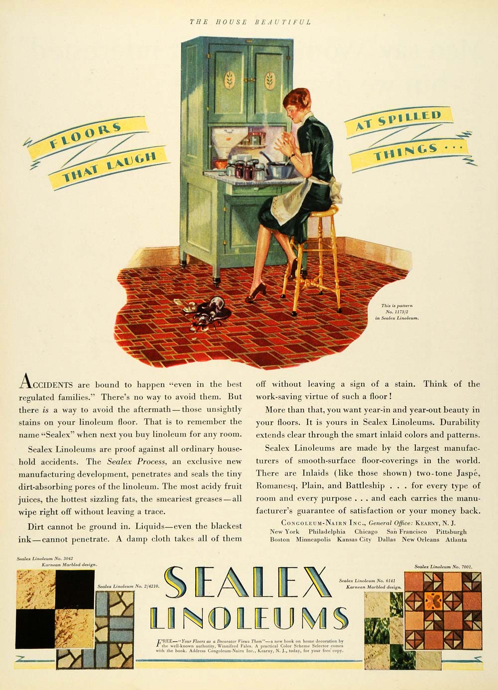 This is an original 1928 color print ad for the Sealex Linoleums Karnean Marble Designs promoting No. 1173, No. 3042, No. 2, No. 6141, No. 7001 from Congoleum-Nairn Incorporation located in Kearny, New Jersey.