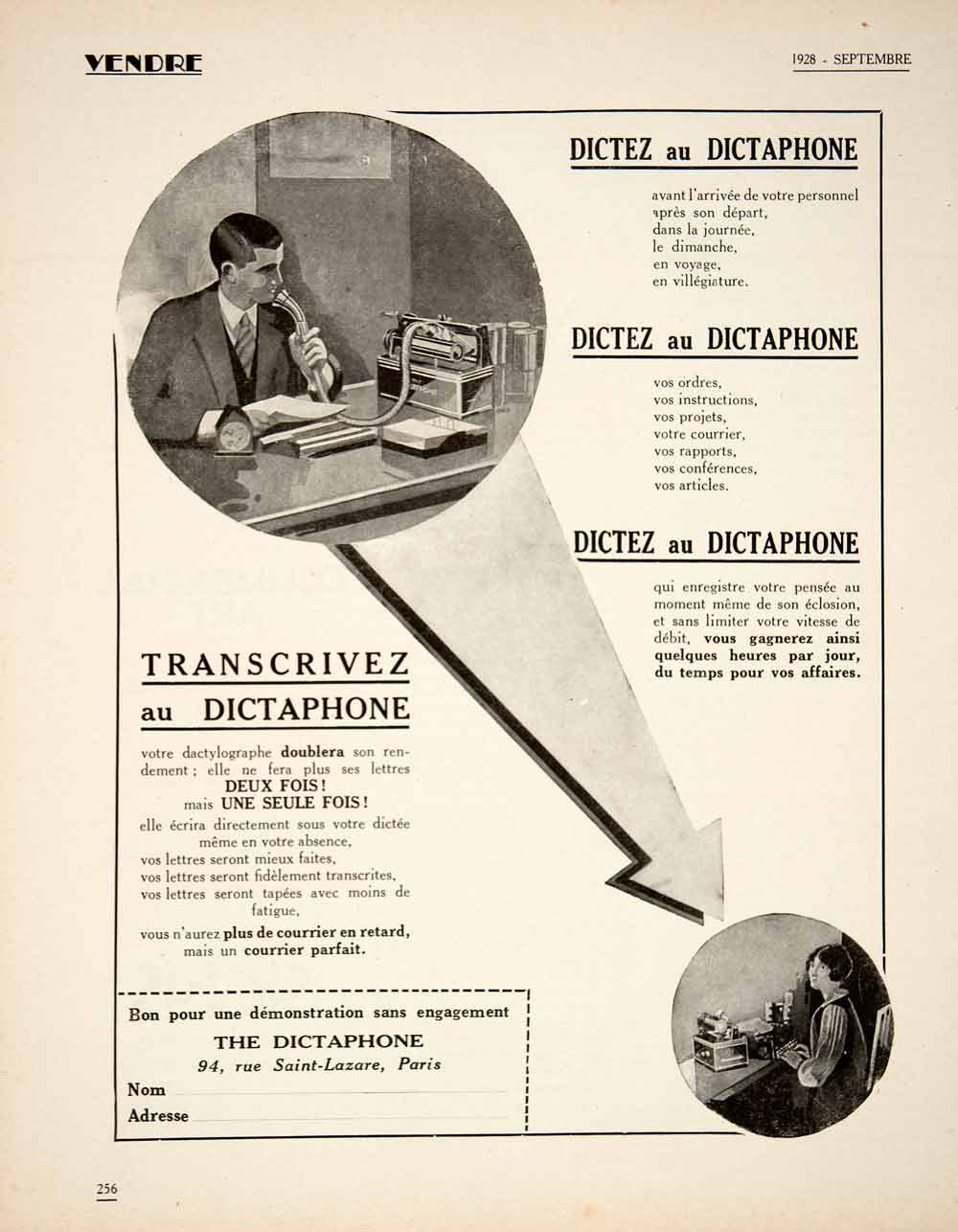 This is an original 1928 black and white print ad for for the Dictaphone.
