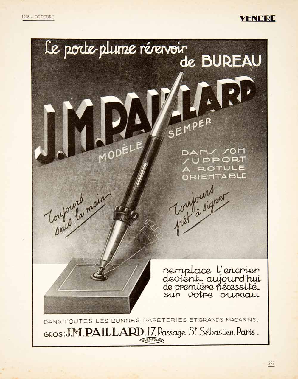 This is an original 1928 black and white print ad for the J. M. Paillard penholder from J. M. Paillard, 17 Passage St. Sebastien, Paris.