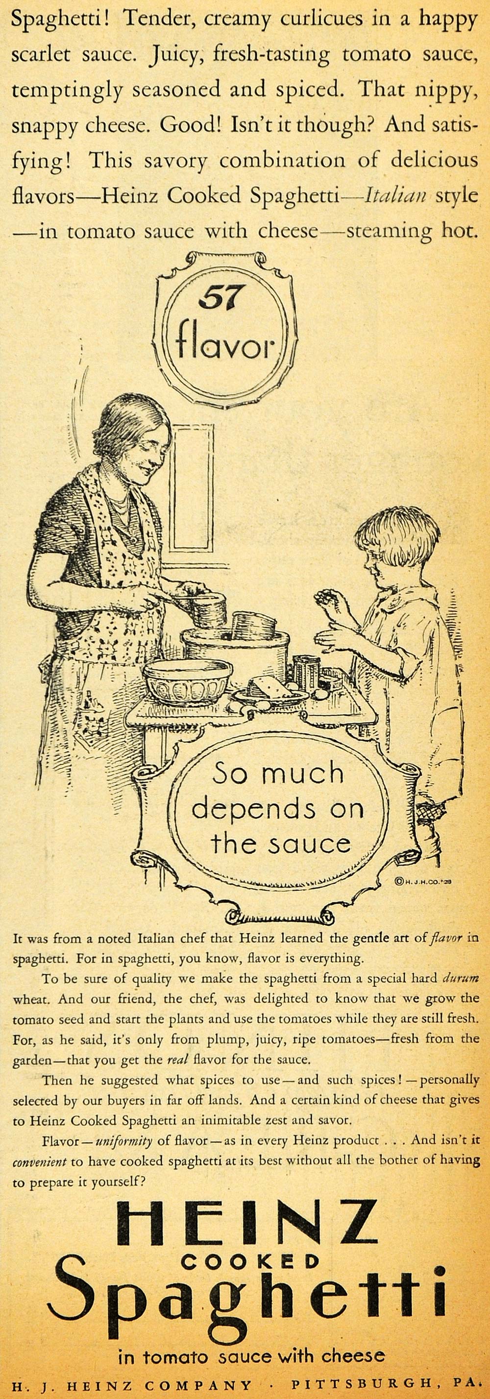 This is an original 1928 black and white print ad for Heinz Cooked Spaghetti in tomato sauce with cheese, a product by the H. J. Heinz Company in Pittsburgh.