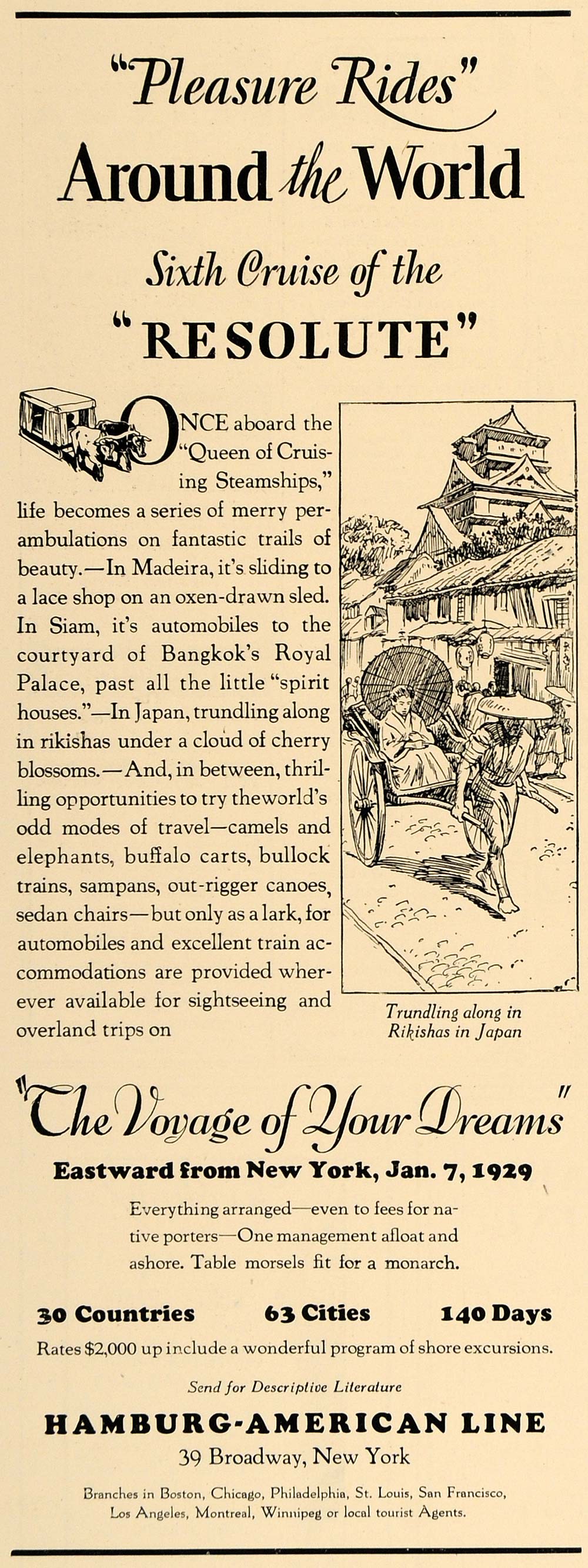This is an original 1928 black and white print ad for Hamburg-American Line cruises.