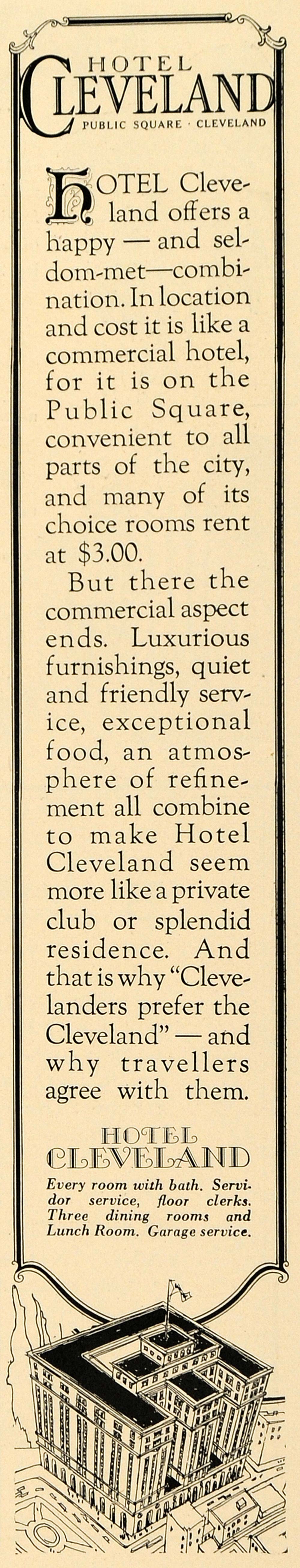 This is a small original 1928 black and white print ad for the Hotel Cleveland, located on the Public Square in Cleveland, Ohio.