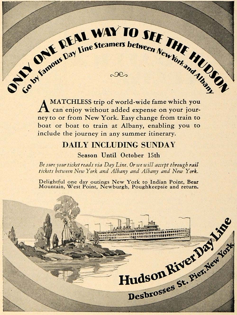 This is an original 1928 black and white print ad for the Hudson River Day Line, located at Desbrosses St. Pier, New York.
