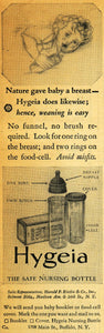 This is a small original 1928 black and white print ad for Hygeia, a nursing bottle for babies, sold by Harold F. Ritchie & Company, located in the Belmont Building on Madison Avenue and 34th Street in New York.