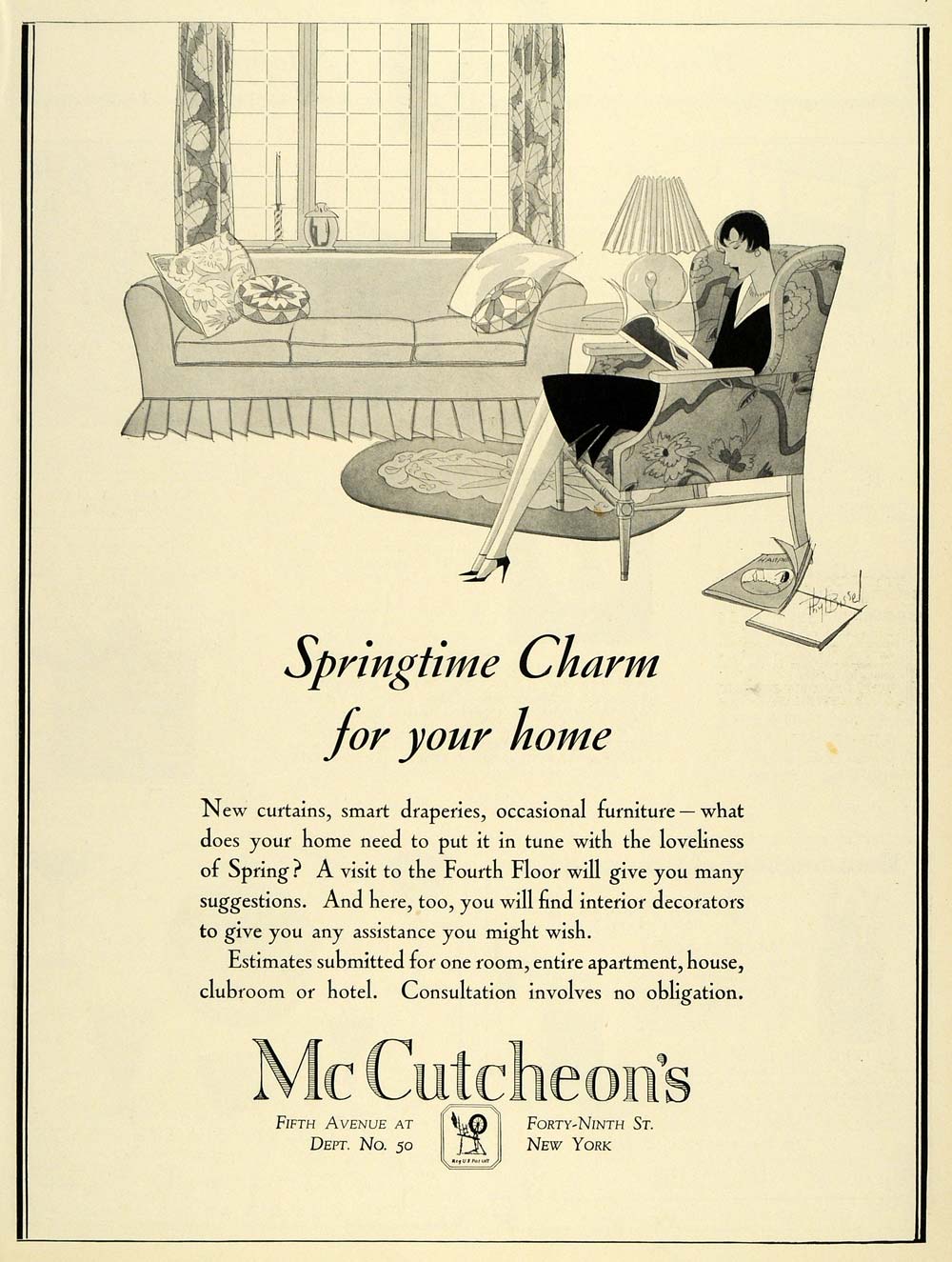 This is an original 1928 black and white print ad promoting curtains, draperies and furniture from McCutcheon's located at Fifth Avenue at Forty-ninth Street, New York City.