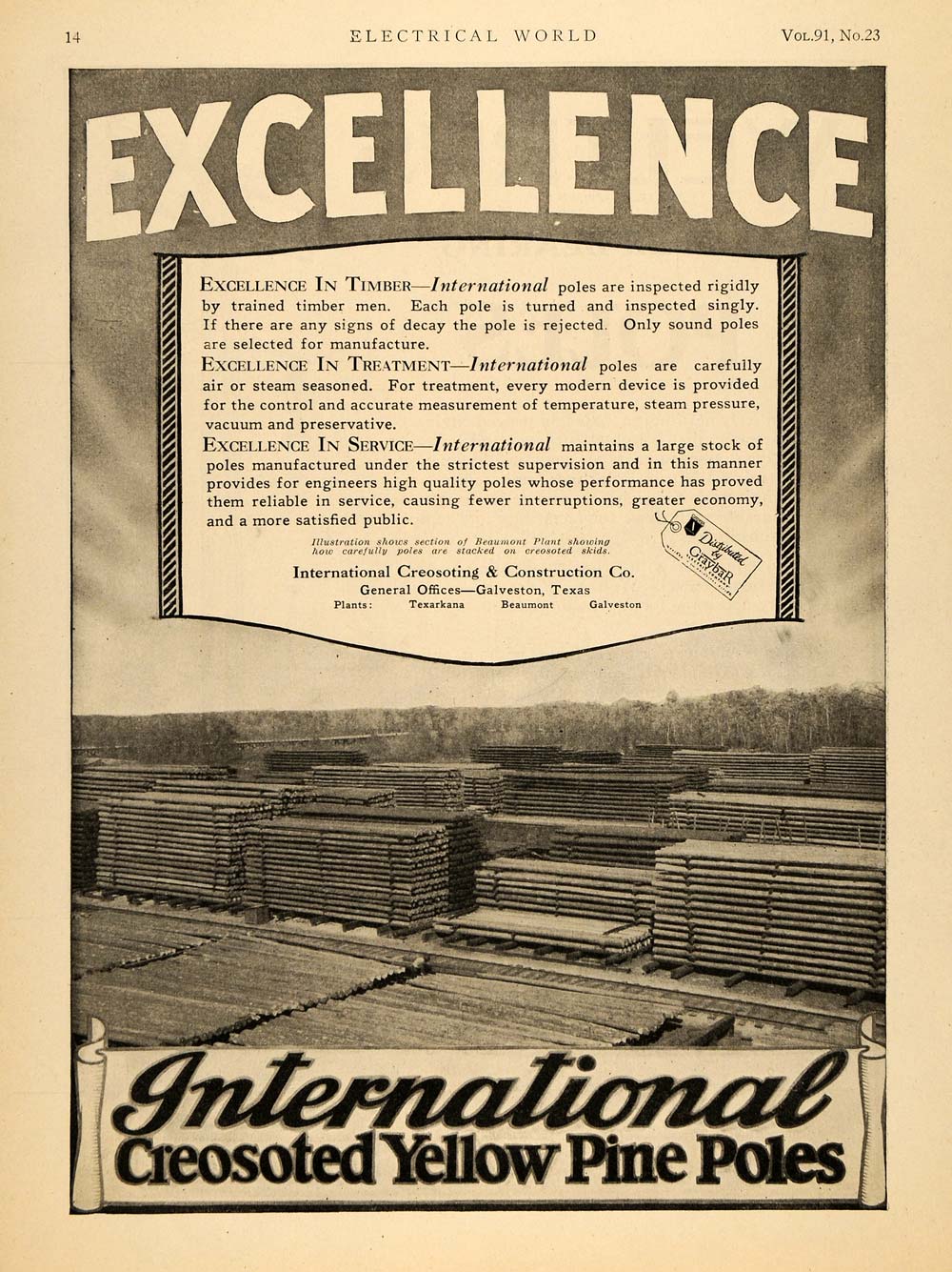 This is an original 1928 black and white print ad for the International Creosoted Yellow Pine Poles from International Creosoting & Construction Company located in Gavelston, Texas.