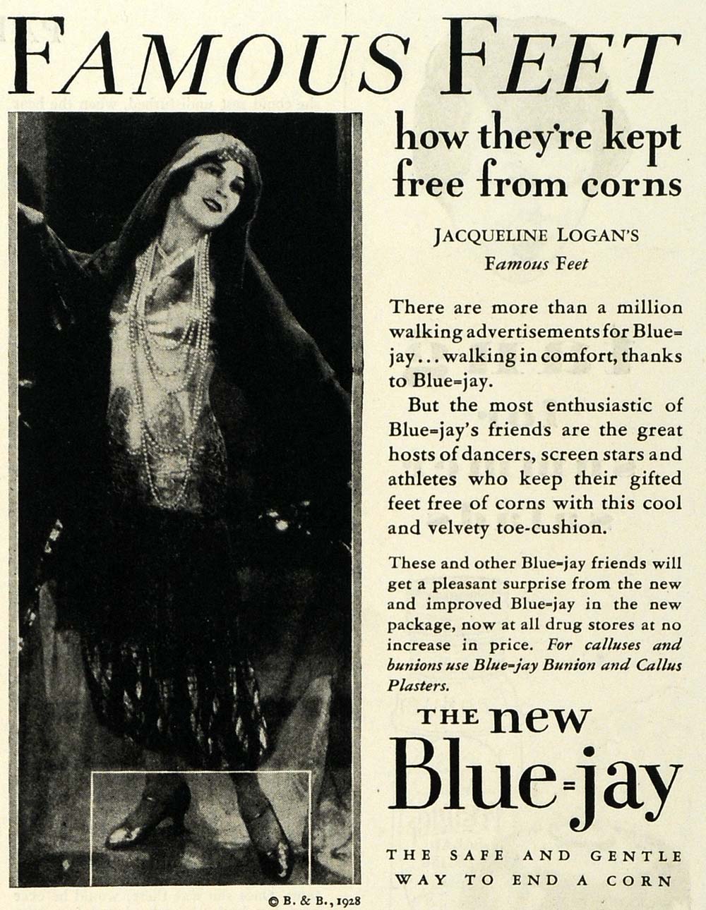 This is an original 1928 black and white print ad for Blue=jay Bunion and Callus Plasters. This ad features the silent motion picture actress Jacqueline Logan. Jacqueline is known for her roles in "The Perfect Crime", "Burning Sands", "Java Head" and "A Man Must Live".