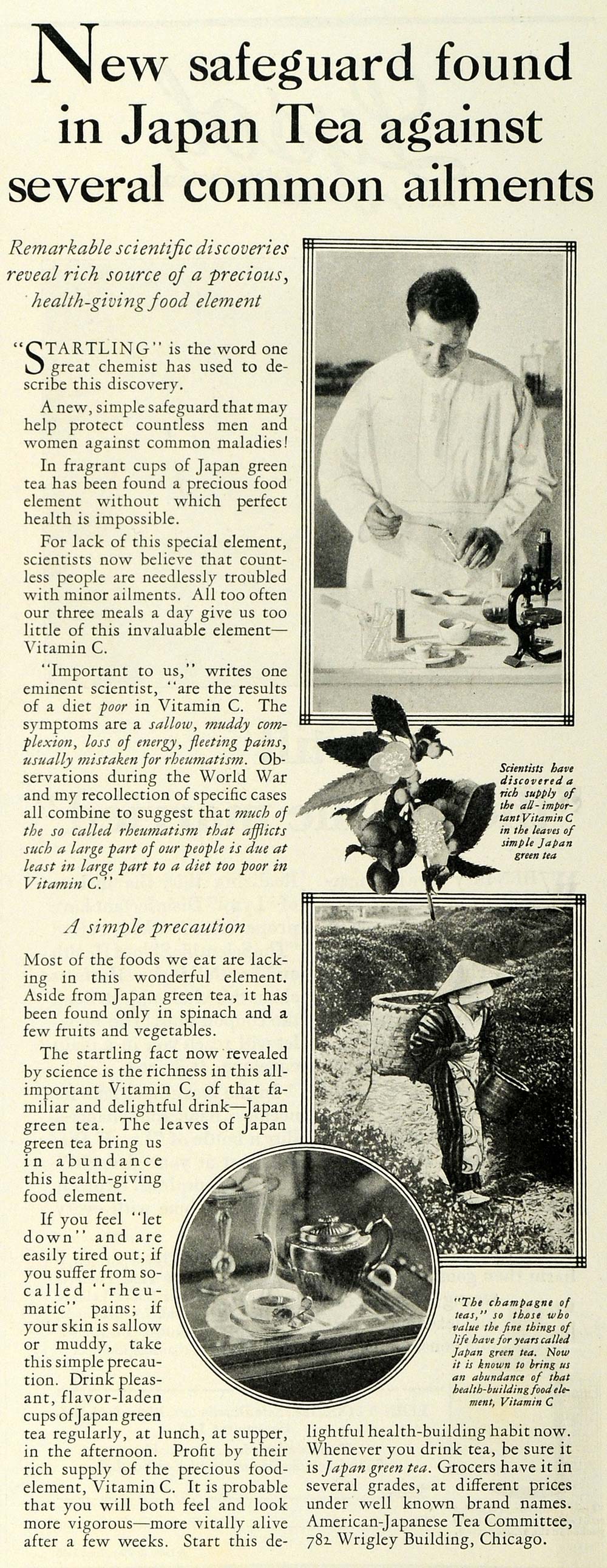 This is an original 1928 black and white print ad for Japanese Green Tea by the American-Japanese Tea Committee, they are located at 782 Wrigley Building, Chicago, Illinois.