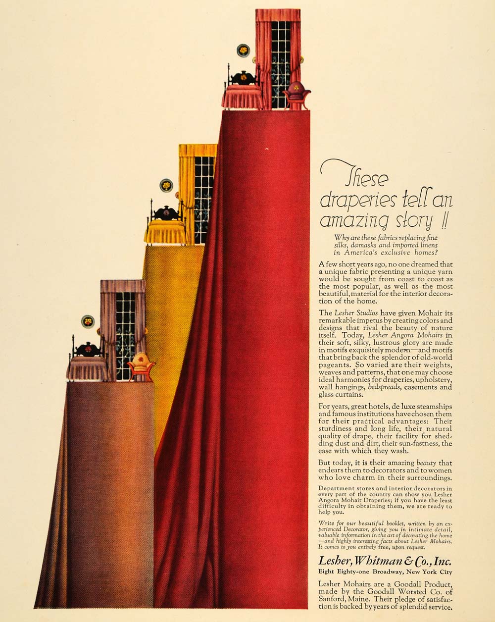 Keywords specific to this image: Vintage Advertising, Mohair, Goodall Worsted, Sanford Maine, Home Decor, Home Improvement