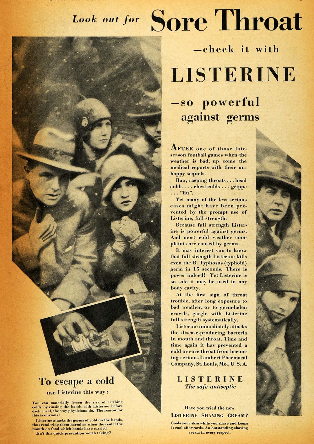This is an original 1928 black and white print ad for Listerine, an antiseptic to help in warding off sore throats and other common cold ailments. Listerine is a product by Lambert Pharmacal Company in St. Louis, Missouri.