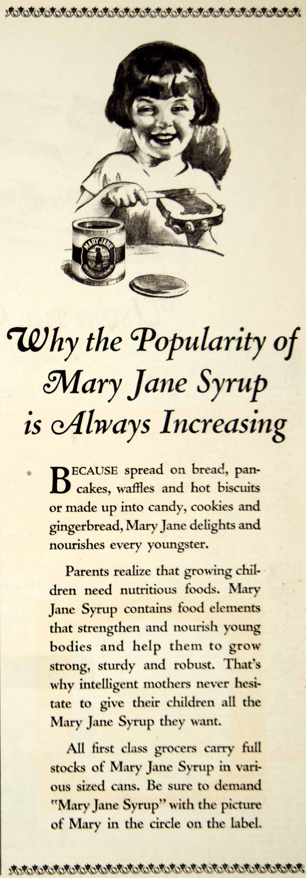 This is an original 1928 black and white print ad for Mary Jane Syrup.