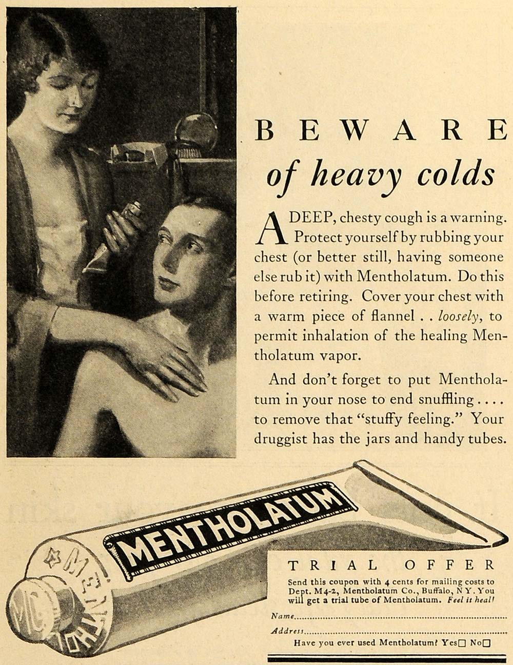 This is an original 1928 black and white print ad for the Mentholatum Company located in Buffalo, New York.