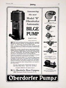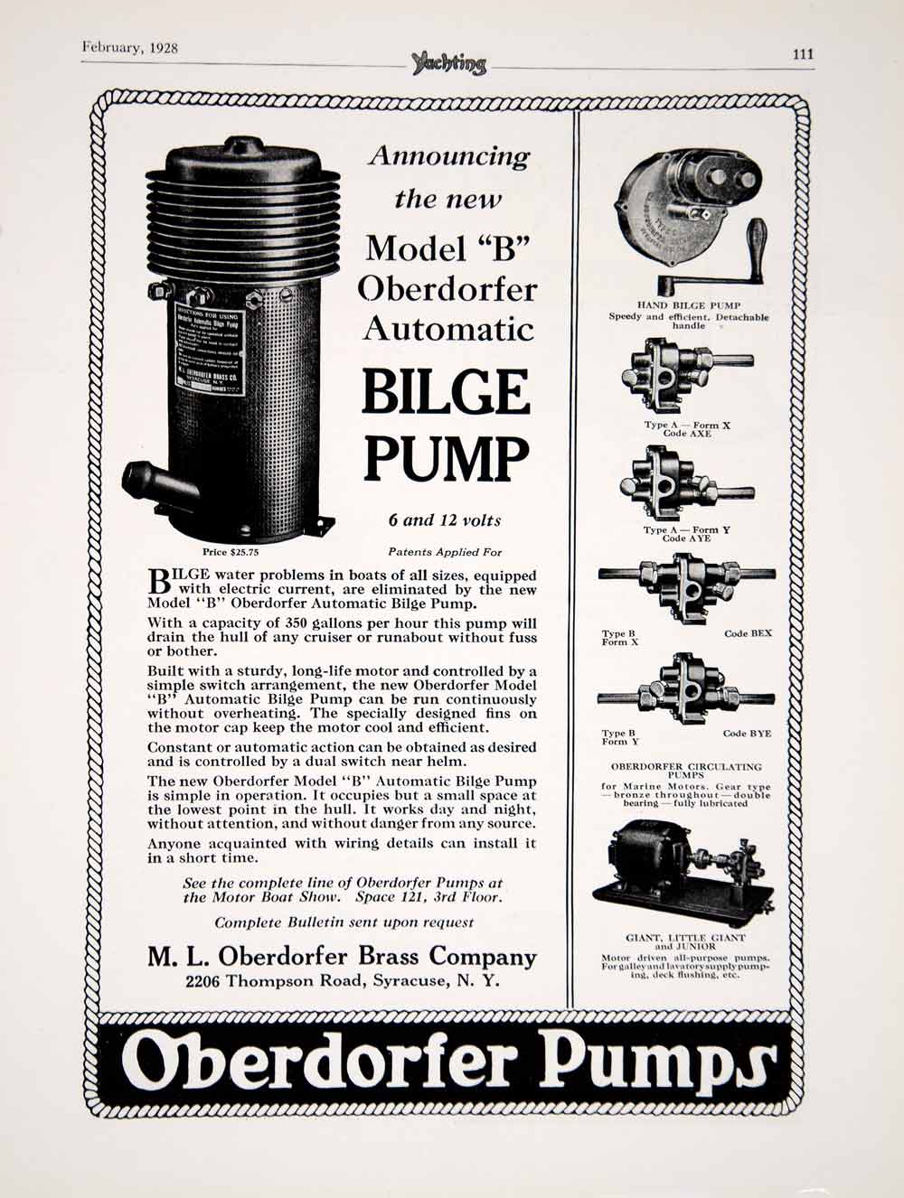 This is an original 1928 black and white print ad for the Model B automatic bilge pumps that were made and sold by the M.L. Oberdorfer Brass Company of 2206 Thompson Road, Syracuse, New York (NY) during the Roaring Twenties era.