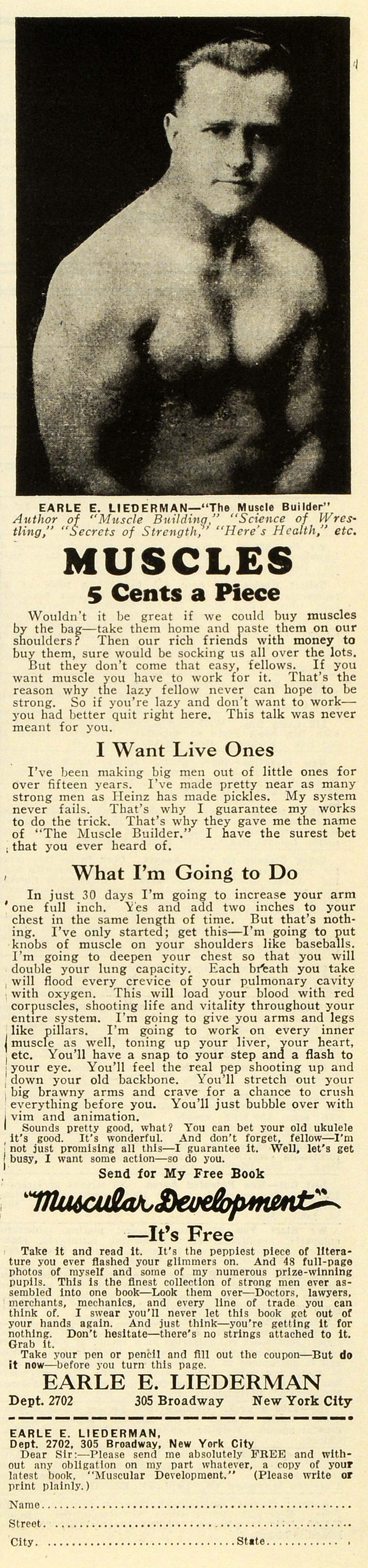 This is a small original 1928 black and white print ad for Earle E. Liederman of 305 Broadway, New York City. Liederman was the author of "Muscle Building," "Science of Wrestling," "Secrets of Strength," and "Here's Health." The caption reads, "Muscles: 5 Cents a Piece."
