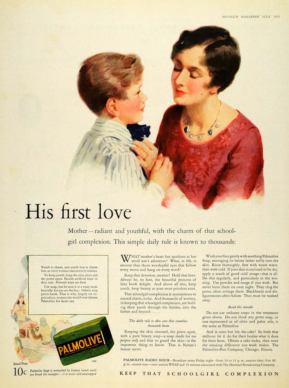 This is an original 1928 color print ad for Palmolive Soap, a product by The Palmolive-Peet Company in Chicago.
