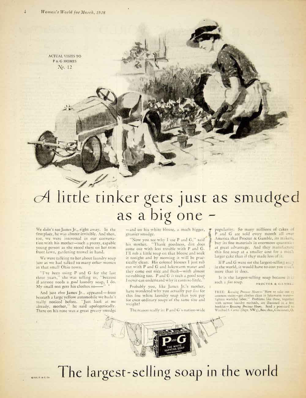 This is an original 1928 black and white print ad for White Naphtha soap and laundry detergent that was made and sold by the Procter & Gamble Company of Cincinnati, Ohio (OH).