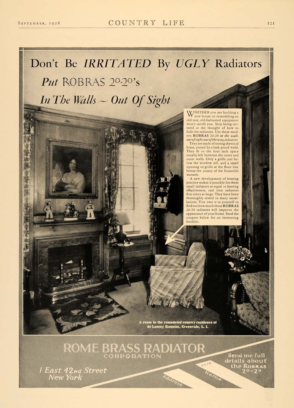 This is an original 1928 black and white print ad for the Rome Brass Radiator. The ad features an image of the living room of de Lancey Kountze, of Greenvale, Louisiana.
