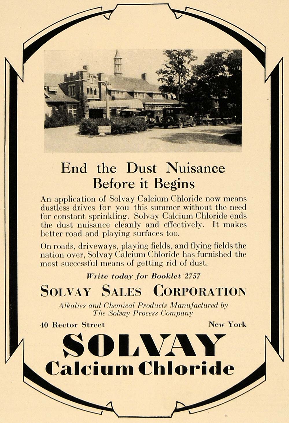 This is an original 1928 black and white print ad for Solvay Calcium Chloride, a chemical that regulates ice and dust on roads.