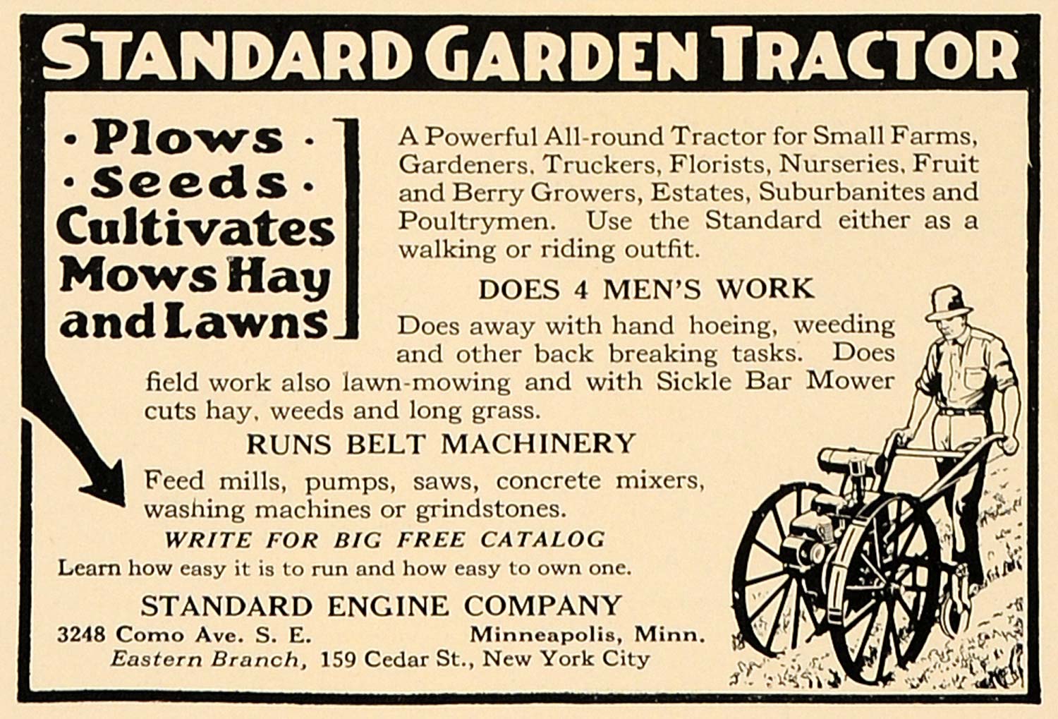 This is an original 1928 black and white print ad for the Standard Garden Tractor by the Standard Engine Company located at 3248 Como Ave S. E., Minneapolis, Minnesota. There is another location at 159 Cedar Street, New York City, New York.