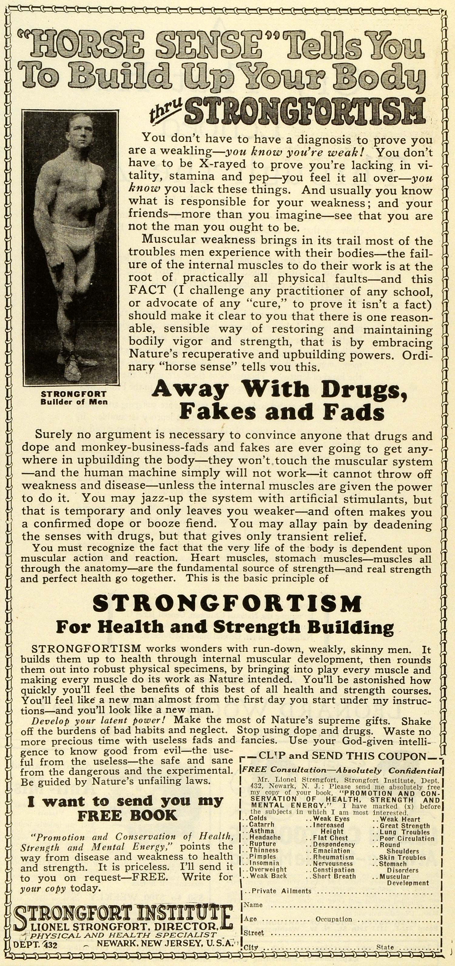 This is an original 1928 black and white print ad for the Strongfort Institute of Newark, New Jersey. The institute claimed to build skinny, sickly men into muscular and physical people. The caption writes, "You don't have to have a diagnosis to prove you are a weakling-- you know you're weak! You don't have to by X-rayed to prove you're lacking in vitality, stamina and pep-- you feel it all over-- you know you lack these things. And usually you know what is responsible for your weakness; and your friends-- more than you imagine-- see that you are not the man you ought to be."