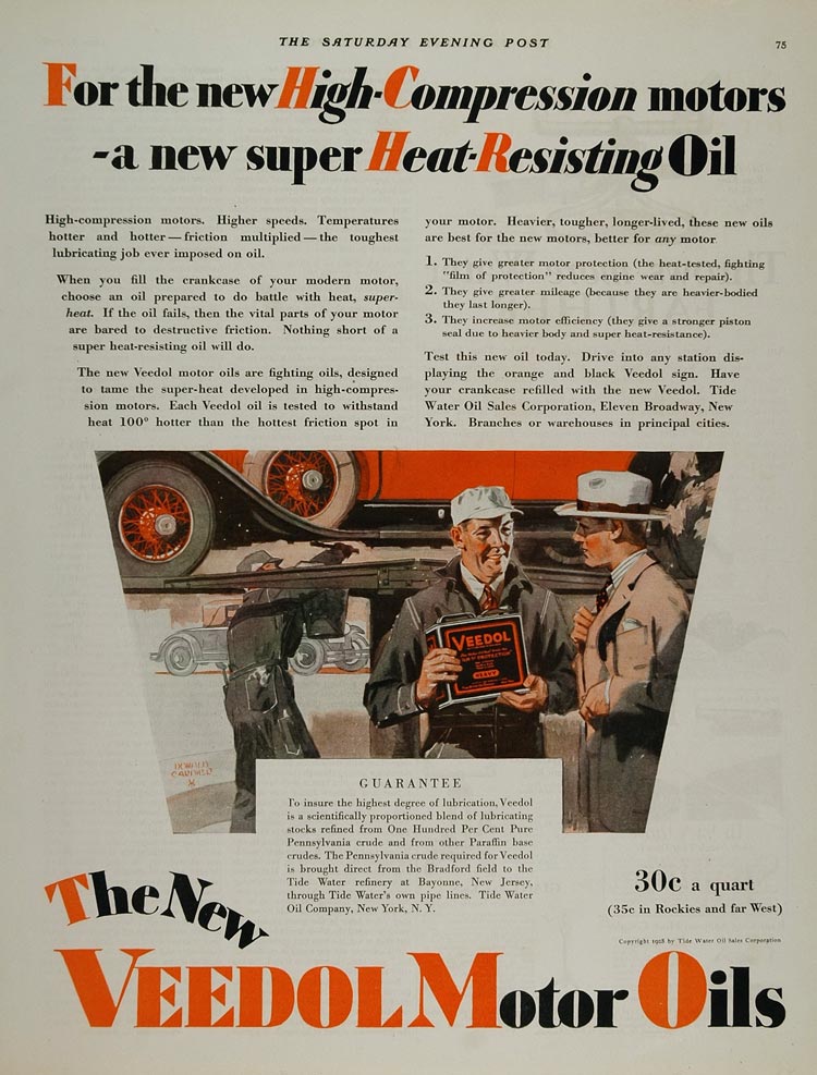 This is an original 1928 two-color print ad for Pennsylvania VEEDOL Motor Oil with an illustration of a car on a lift at a service station.