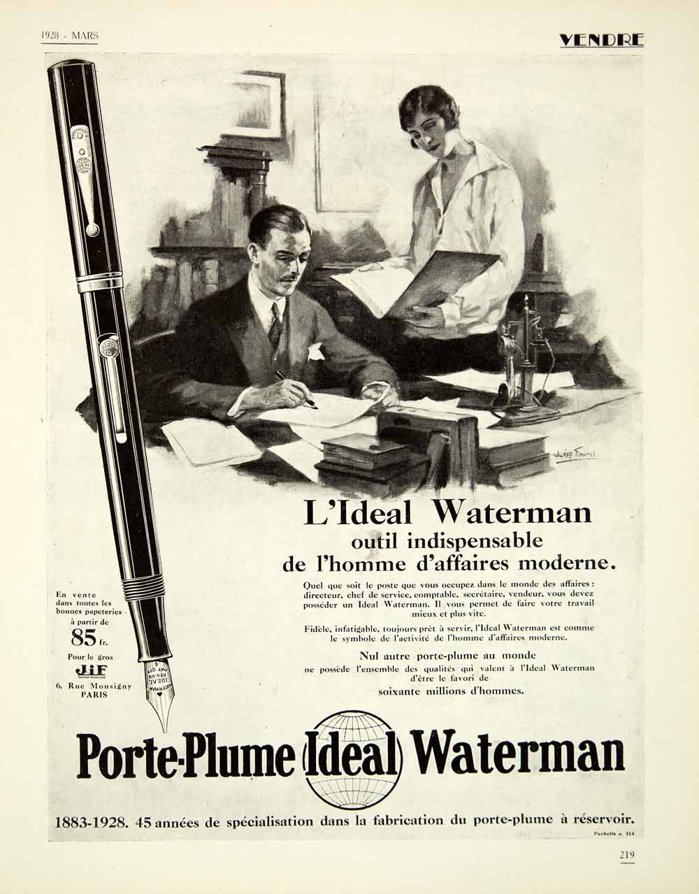 This is an original 1928 black and white print ad for Waterman fountain pens, with offices at 6 rue Monsigny, Paris.