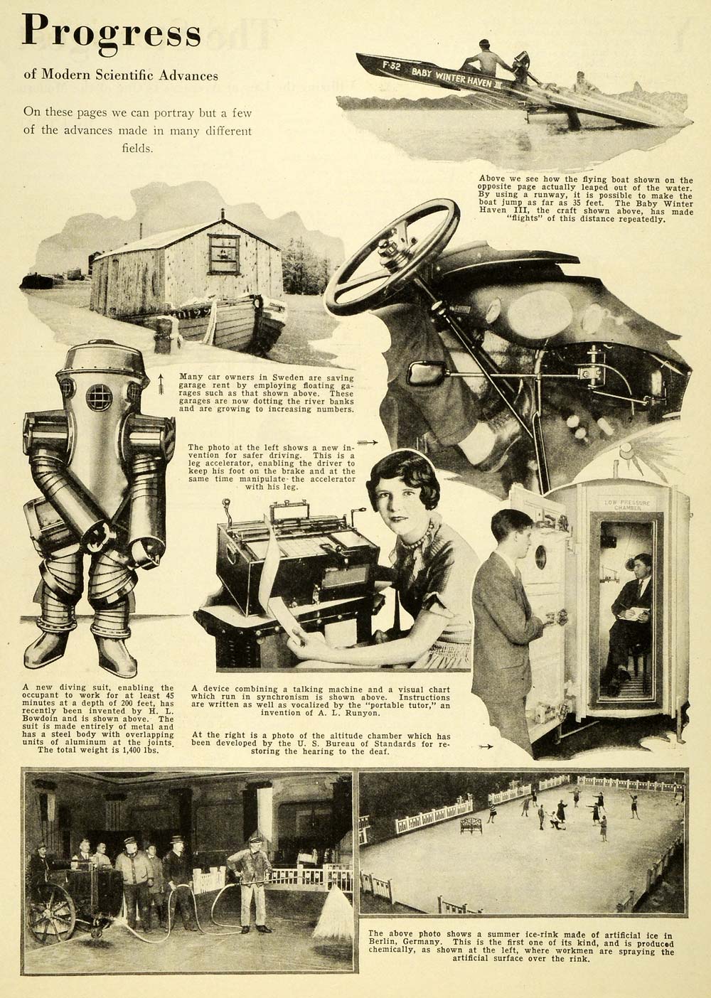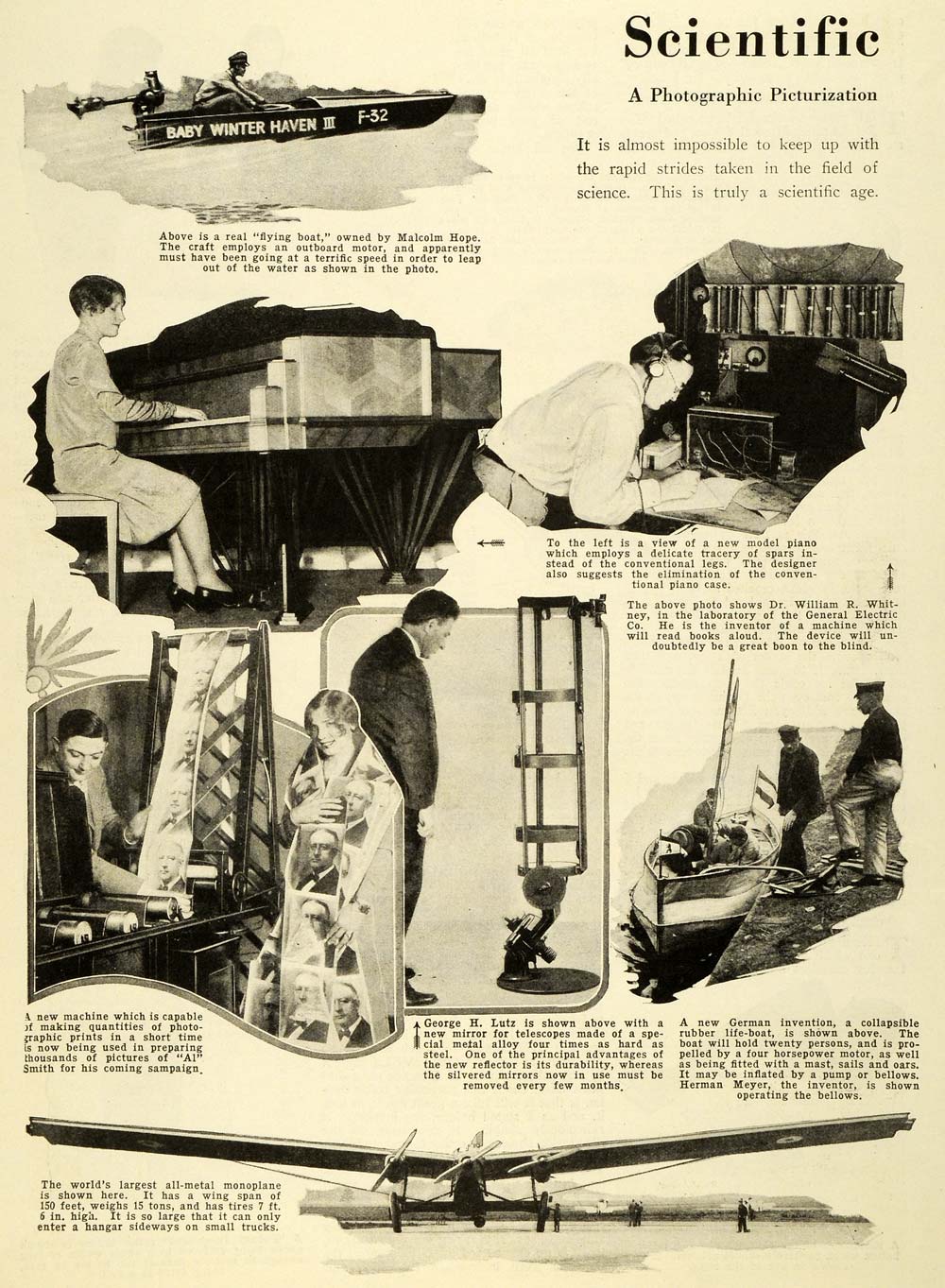 This is an original 1928 two-page article (two single-sided pages) titled, "Scientific Research." The article features a flying boat owned by Malcolm Hope, William R. Whitney in the laboratory of General Electric, a German rubber lifeboat by Herman Meyer, George H. Lutz with a mirror for telescopes, a monoplane, a floating garage, the Baby Winter Haven III, a new diving suit by H. L. Bowdoin, a talking machine by A. L. Runyon, and a summer ice rink in Berlin, Germany (Deutschland).