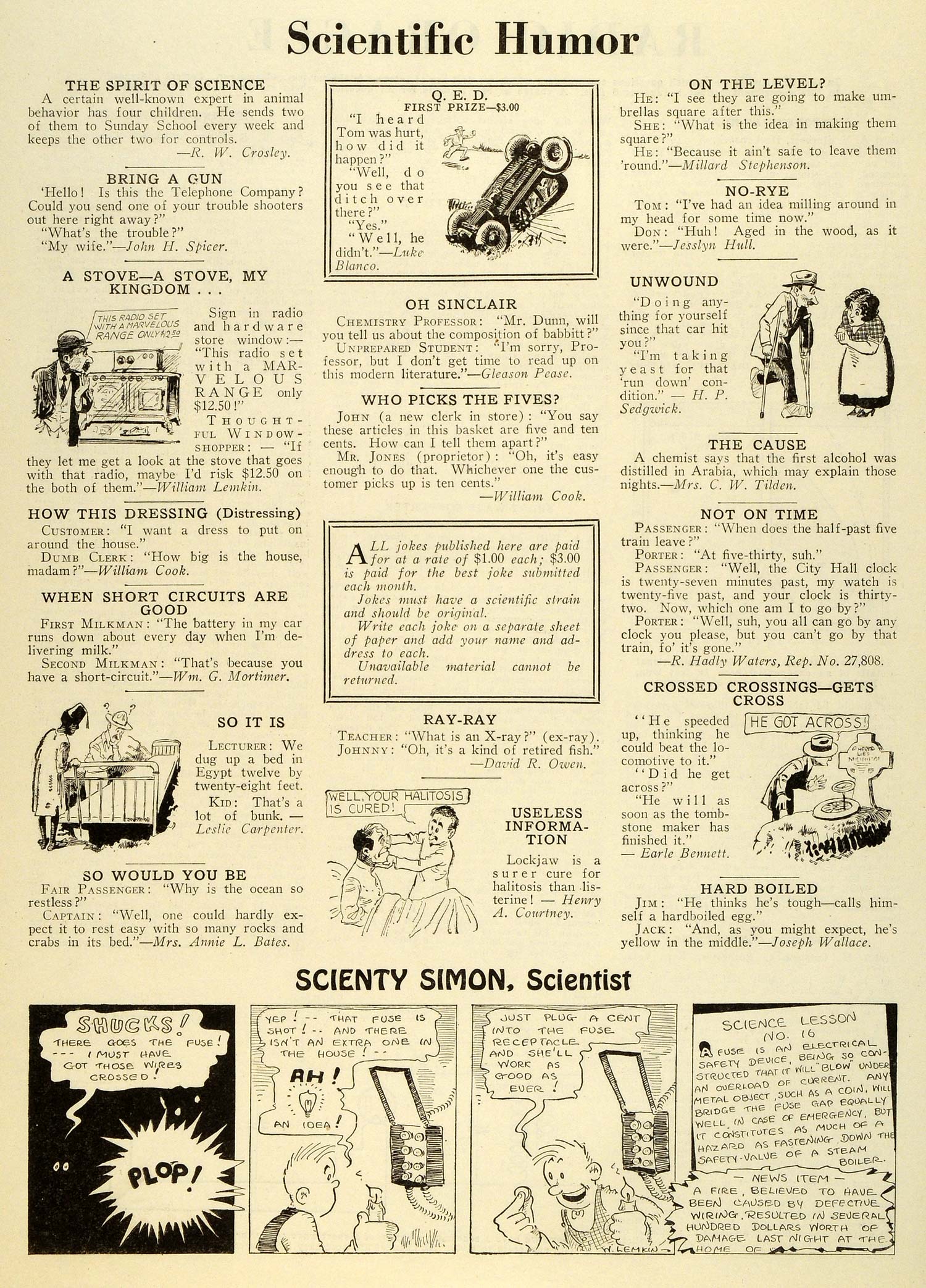 This is an original 1928 one-page article (one single-sided page) titled, "Scientific Humor." Shown are jokes sent from R. W. Crosley, John H. Spicer, WIlliam Lemkin, William Cook, William G. Mortimer, Leslie Carpenter, Annie L. Bates, Gleason Pease, Luke Blanco, David R. Owen, Henry A. Courtney, Joseph Wallace, Earle Bennett, R. Hadley Waters, Mrs. C. W. Tilden, H. P. Sedgwick, Jesslyn Hull, and Millard Stephenson. Also offered is the cartoon "Scienty Simon, Scientist."