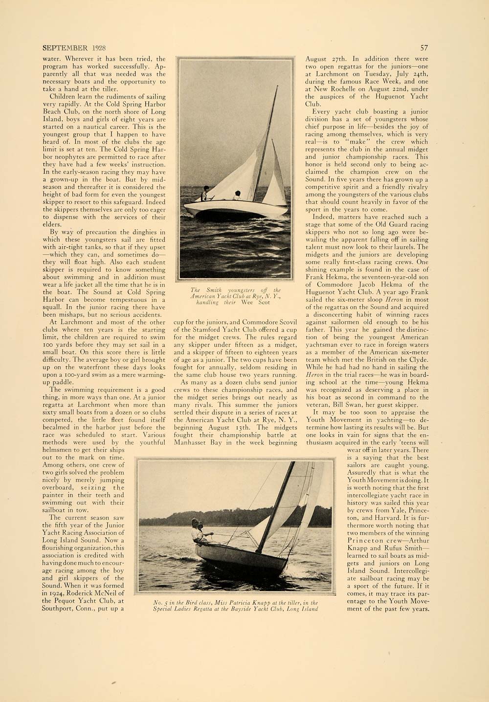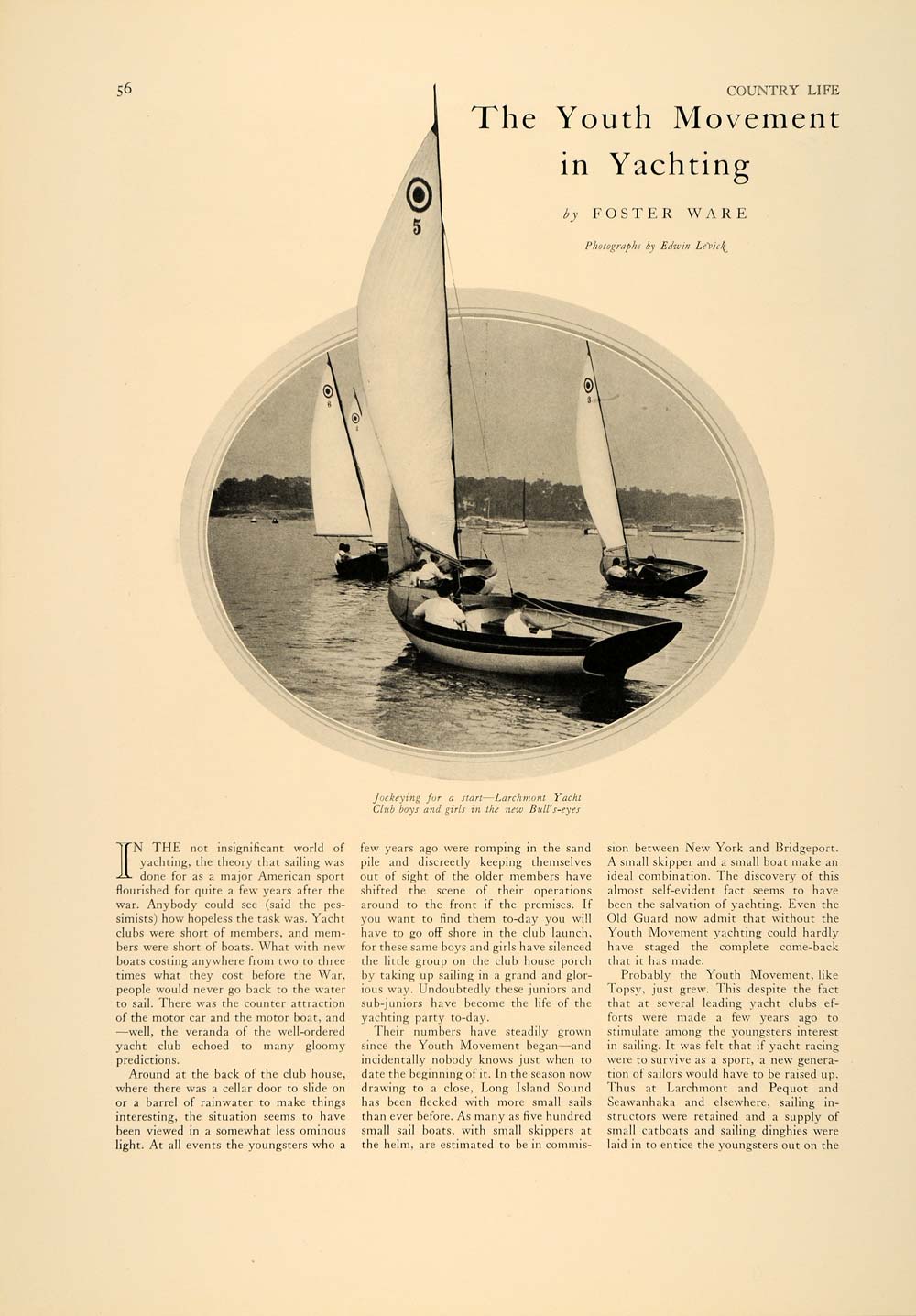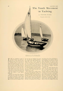 This is an original 1928 2 page article titled, "The Youth Movement in Yachting," by Foster Ware. Photography by Edwin Levick. The ad writes, "In the not insignificant world of yachting, the theory that sailing was done for as a major American sport flourished for quite a few years after the war..." The article highlights Frank Helma, Arthur Knapp, Rufus Smith, Roderick McNeil, Commodore Scovil, and others. Please see additional images.