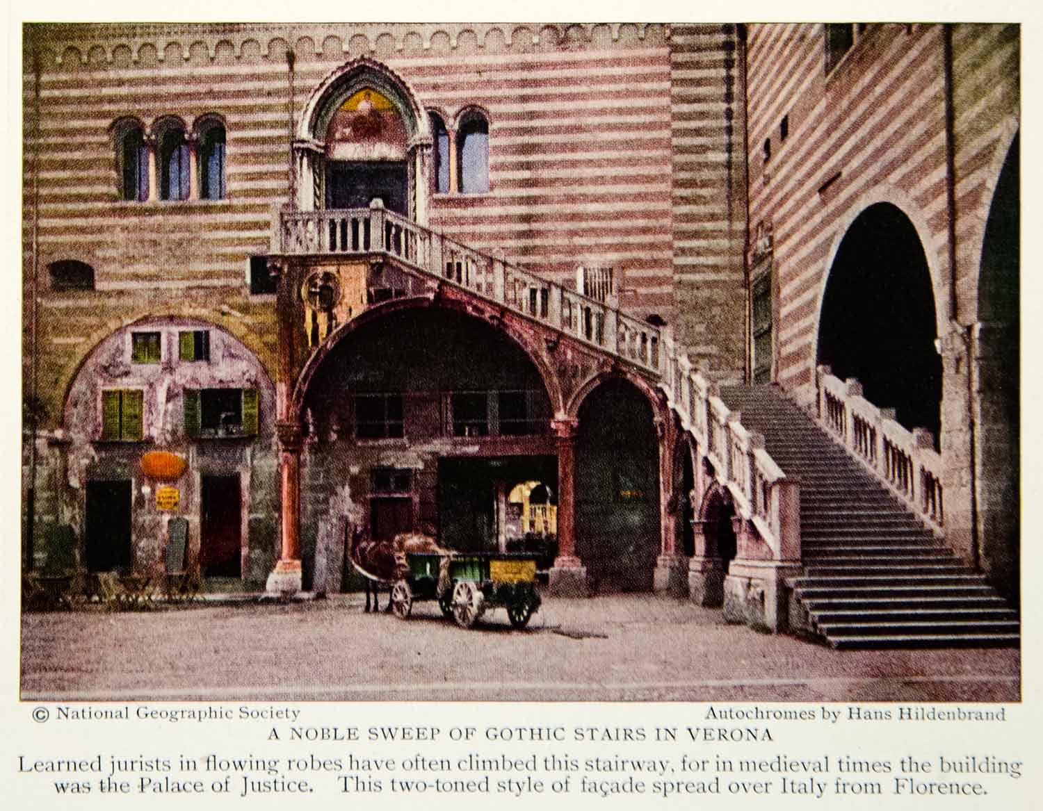 This is an original 1928 color print of the gothic style stairwell leading up to the building that was once the Palace of Justice in Verona, Italy.
