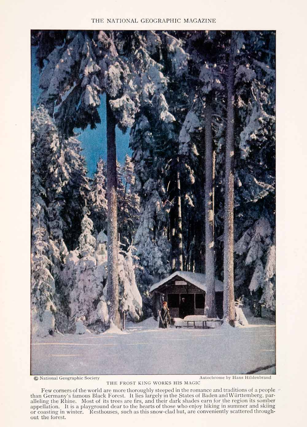 This is an original 1928 color print of a renthouse (common throughout the area) in the midst of a winter wonderland in the Black Forest region, which includes Baden and Württemberg. Photography courtesy of Hans Hildenbrand.