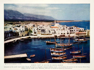 "Fishing Fleet at Anchor in Kyrenia Harbor" This is an original 1928 color print of the harbor at Kyrenia, on the northern coast of the Mediterranean Island of Cyprus. Just outside the town sits Bella Païse Abbey and the Saint Hilarion Castle.