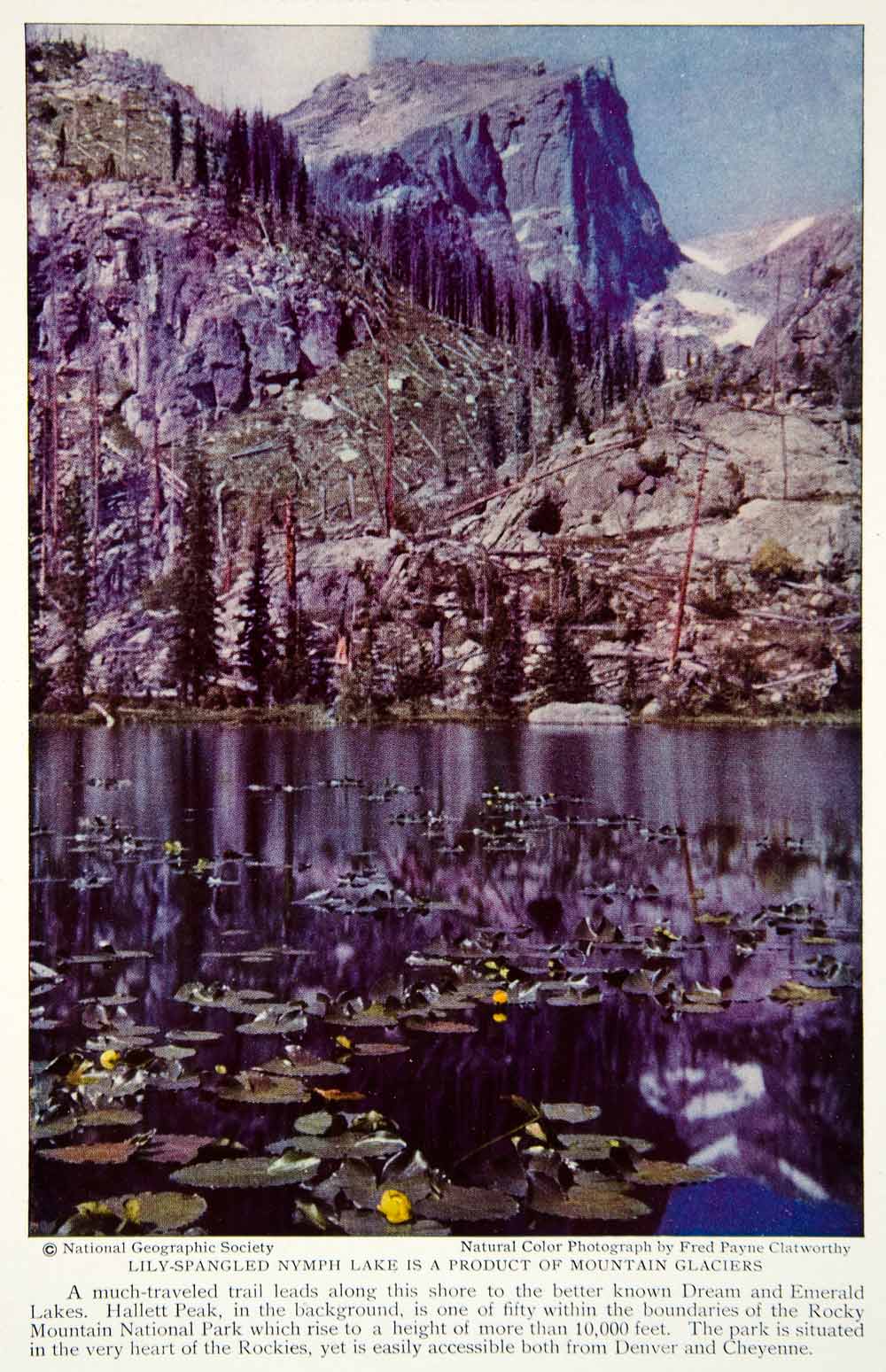 This is an original 1928 color print of Nymph Lake, a small walk from Dream and Emerald Lakes, situated in the Rocky Mountain National Park, based in the heart of the Rockies and 10,000 feet above sea level.