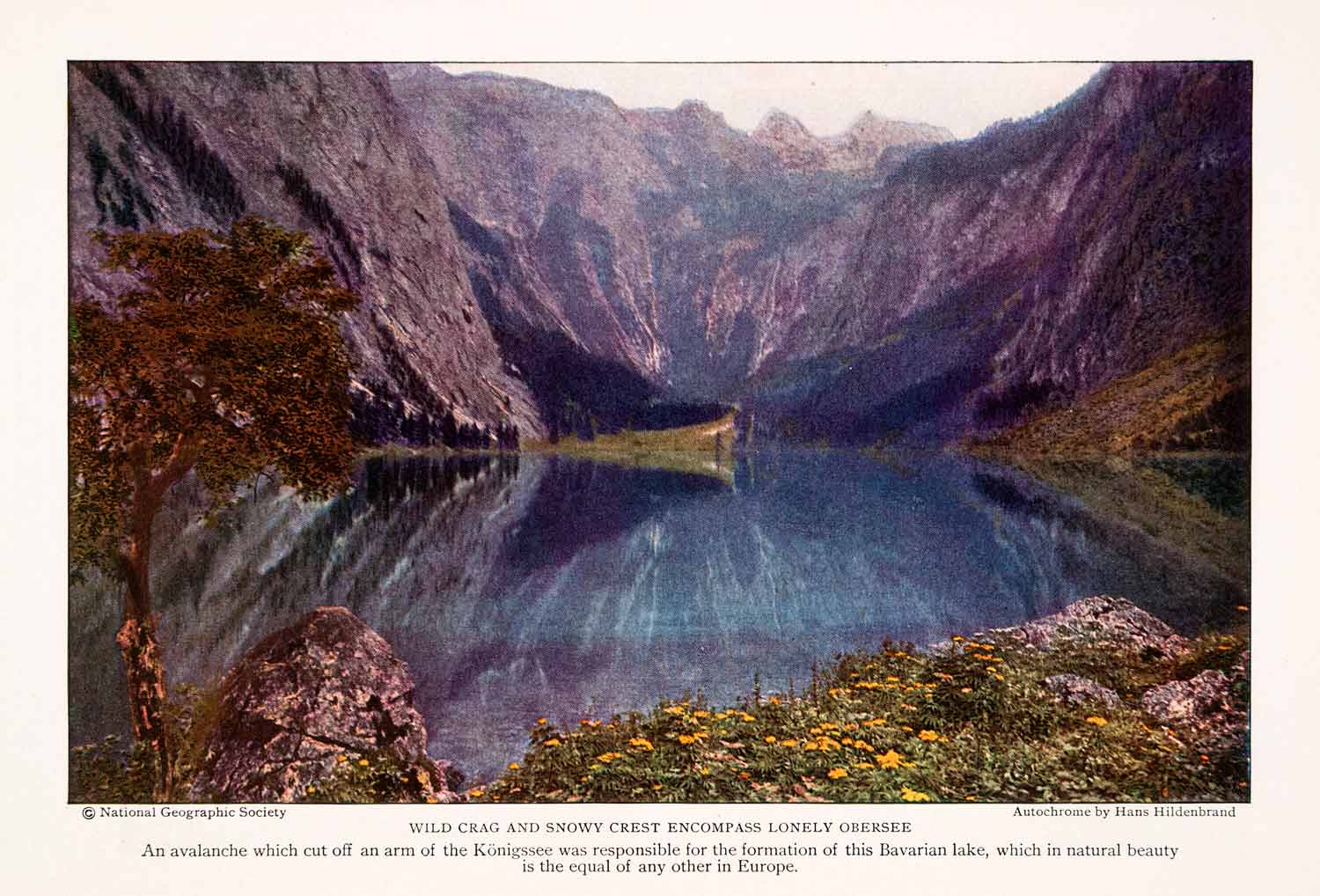 This is an original 1928 color print of a Bavarian lake in Obersee, Germany, which had been previously formed by an avalanche that destroyed a portion of the Königssee. Photography courtesy of Hans Hildenbrand.