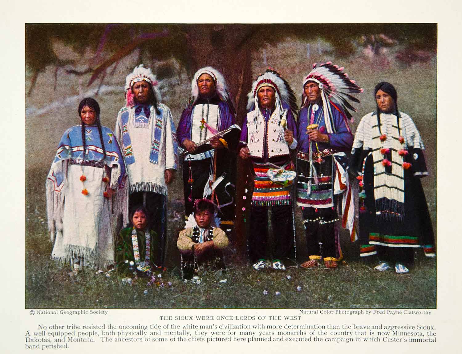 This is an original 1928 color print of a line of Sioux Indians in their traditional garb. The Sioux resisted the encroachment of the United States Government and military aggressively, attempting to maintain their lands in Minnesota, the Dakotas, and Montana. The remnants of this once mighty tribe now fight just as hard, only instead of the bow and arrow they have the picket sign, and instead of brutally and heroically defending their homes from a foreign invader, they sit outside Washington Redskins Football games.