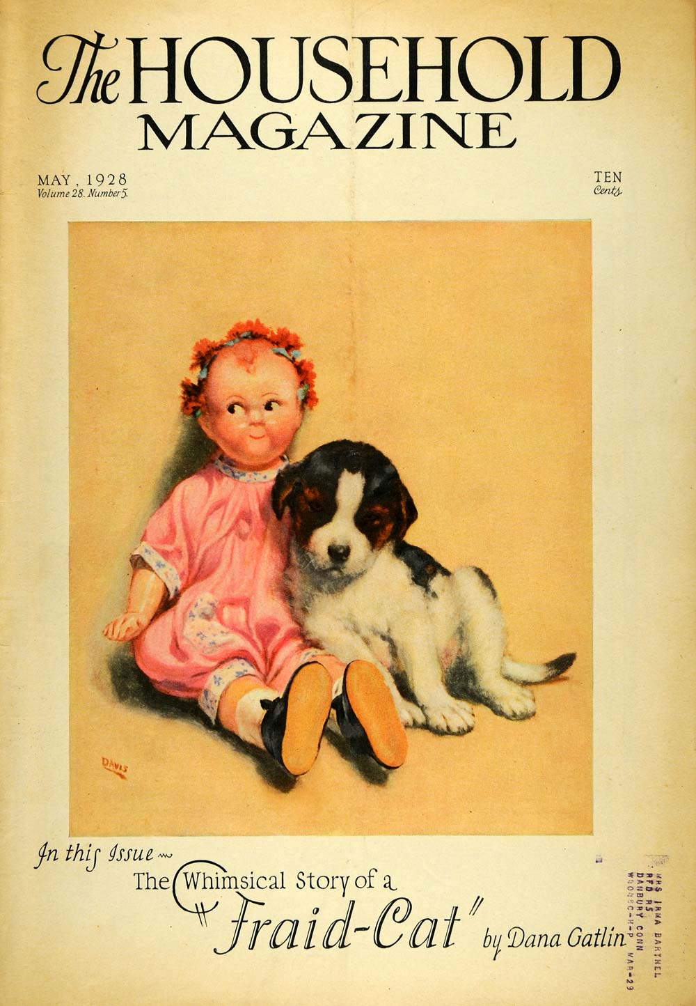 This is an original 1928 color cover for the May issue of The Household Magazine, featuring an image by Davis of a puppy leaning up against a baby doll.CONDITION