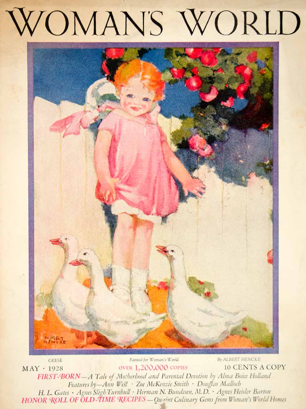 This is an original 1928 color cover for Woman's World magazine May, 1928 that featured a painting by Albert Hencke that portrayed a little girl playing outside with a gaggle of geese.