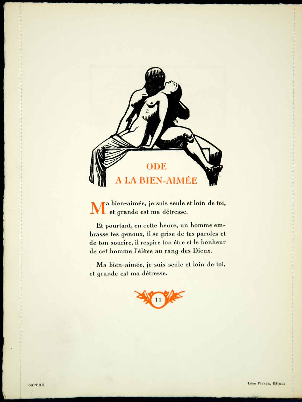 This is an original 1928 two-color in-text lithograph of an illustrated page by the Swiss-born illustrator and painter, Charles Émile Egli (known as Carlègle) (1877-1937) for the book Sappho by René Puaux (Pichon, 1926). Please note the deckle edge on the bottom, top, and left margins.