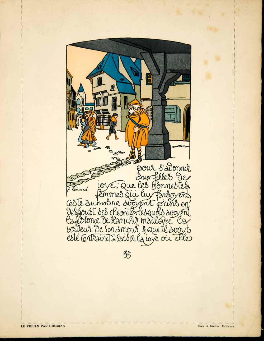 This is an original 1928 color lithograph of a page illustration by the French book illustrator, Joseph Hémard (1880-1961), for the book Les Contes Drolatiques by Honore de Balzac (Éditions Crè_s, 1926). Please note the deckle edge on the bottom and right margins.