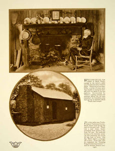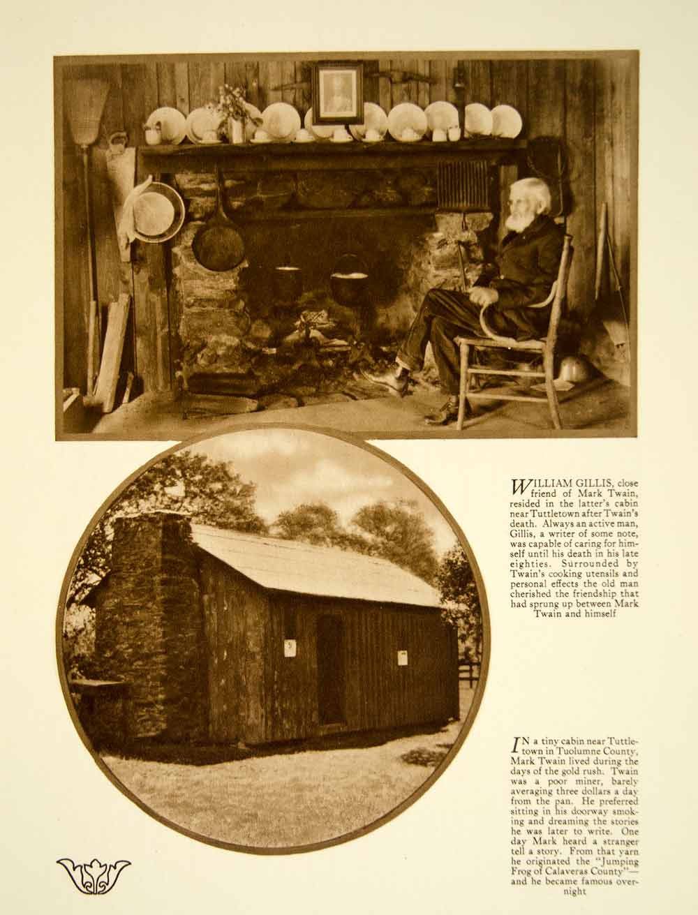 This is an original 1928 sepia photogravure of the cabin of Mark Twain (pen name of Samuel Clemens, 1835-1910), the American writer and humorist, near Tuttletown in Tuolumne County, California. The top images shows William Gillis, a close friend of Twain, sitting by the fireplace.
