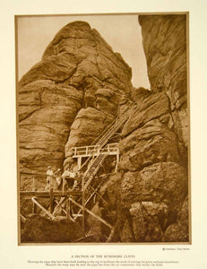 This is an original 1928 sepia photogravure of a section of the Rushmore Cliffs, Black Hills, South Dakota showing the stairs used in the carving the faces of four presidents (George Washington, Thomas Jefferson, Theodore Roosevelt and Abraham Lincoln) into the granite rock.