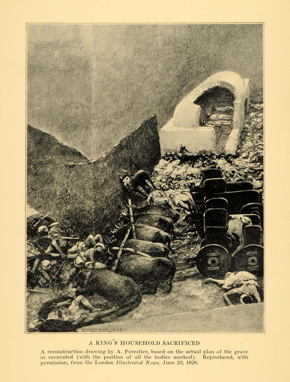 This is an original 1928 halftone print featuring "A King's Household Sacrificed" a reconstruction drawing by A. Forestier of the excavations at Ur., based on the actual plan of the grave as excavated (with the position of all the bodies marked). Reproduced, with permission, from the London